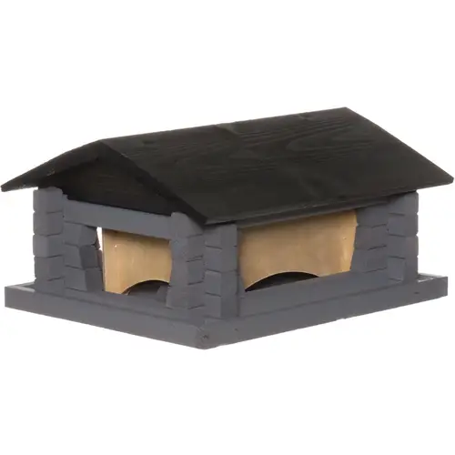 Традиционная деревянная доска для птиц из ели для двора. Крыша окрашена в тёмно-серый цвет, домик — в серый. Крепится снизу к столбу.