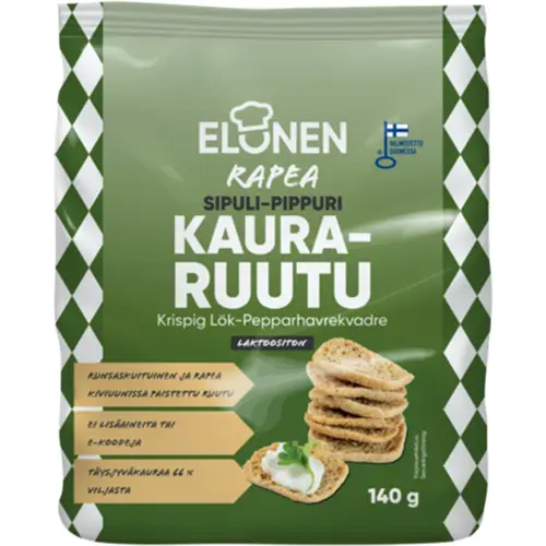 Хрустящие овсяные квадратики Elonen с луком и перцем идеально сочетают в себе вкус лука и перца. Квадратики, выпеченные в каменной печи, на 66% состоят из цельного зерна овса. Они богаты вкусом и клетчаткой. Начините хлебцы по своему вкусу и наслаждайтесь!