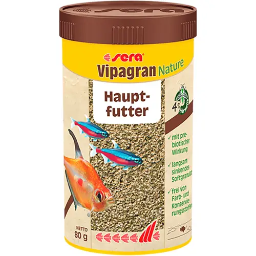 Корм для рыб Sera Vipagran Nature изготовлен из мягких гранул без красителей и консервантов. Он является отличным основным кормом для всех рыб, обитающих в средних слоях воды. Сбалансированный, мягкий и однородный состав корма с натуральными ингредиентами и пребиотиками способствует здоровому росту и развитию рыб. Подходит также для рыб с маленьким ртом и узким ртом. Мука из насекомых – высококачественный источник белка. Медленно тонущие и отлично растворимые гранулы сохраняют форму и не мутнят воду.