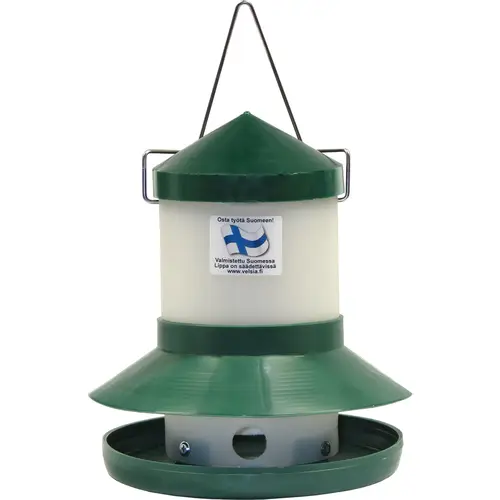 Финская кормушка Velsia для птиц, живущих на улице. Прозрачный двухлитровый контейнер вмещает около 1 кг очищенных семечек подсолнечника или около 1,5 кг очищенных семян. Высоту откидной крышки кормушки можно регулировать в соответствии с потребностями птиц в вашем дворе.