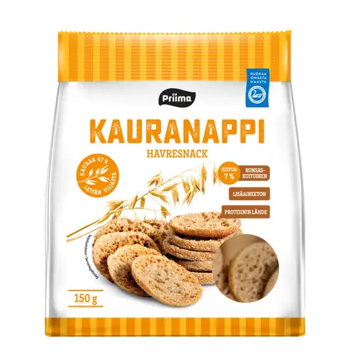 Сушеные овсяные хлопья Priima можно использовать во многих целях: они отлично подходят в качестве закуски, обмакивая их в муку, и служат основой для вечерних закусок. Овсяные чипсы с высоким содержанием клетчатки выпекаются из 67% овса и содержат 7% клетчатки. Вы можете поджарить чипсы в тостере или добавить к ним различные начинки, например, сливочный сыр.