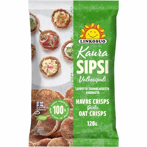 Хрустящие овсяные чипсы Linkosuo с чесноком — настоящее финское лакомство. Можно есть прямо из упаковки или добавлять любимые начинки.