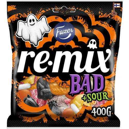 Fazer Remix — это универсальная смесь для конфет, предлагающая варианты на любой вкус. Remix Bad предлагает самую безумную смесь для Хэллоуина: пикантные привидения и тыквы, скользкие жуки, шоколад и хрустящие батончики. Также в набор входят любимые конфеты из пакета Remix Mad, энергетические фрукты и кола.